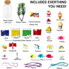 1. Value Craft Kit - 45 Pieces DIY Kit contains 3 plastic bottles with corks, 1 transparent rod, 9 bags of expanding water beads (1g) each, 3 ribbons (55cm) each, 3 bags of colored stone (10g) each, 6 plastic plants, 1 bee figurine, 1 dragonfly, 2 unicorn figurines, 2 rainbow figurine, 2 cake figurine, 1 pizza figurine, 1 candy figurine, 1 ice cream figurine, 1 popcorn figurine, 1 donuts figurine, 3 fish figurine, 1 lighthouse figurine, 1 whale figurine, 1 starfish figurine, 1 instruction sheet.