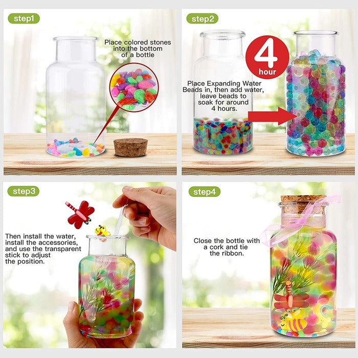 4. Funny and Educational - Put the expanding water beads in the water, place a pack of colored stones into the bottom of a bottle, add the expanding water beads into the bottle, then add 70ml distilled water into the bottle. Place the plant in the center of the bottle and the figurines around and plant. Finally, close the bottle with a cork and tie the ribbon. Then you will own your own terrarium kit.