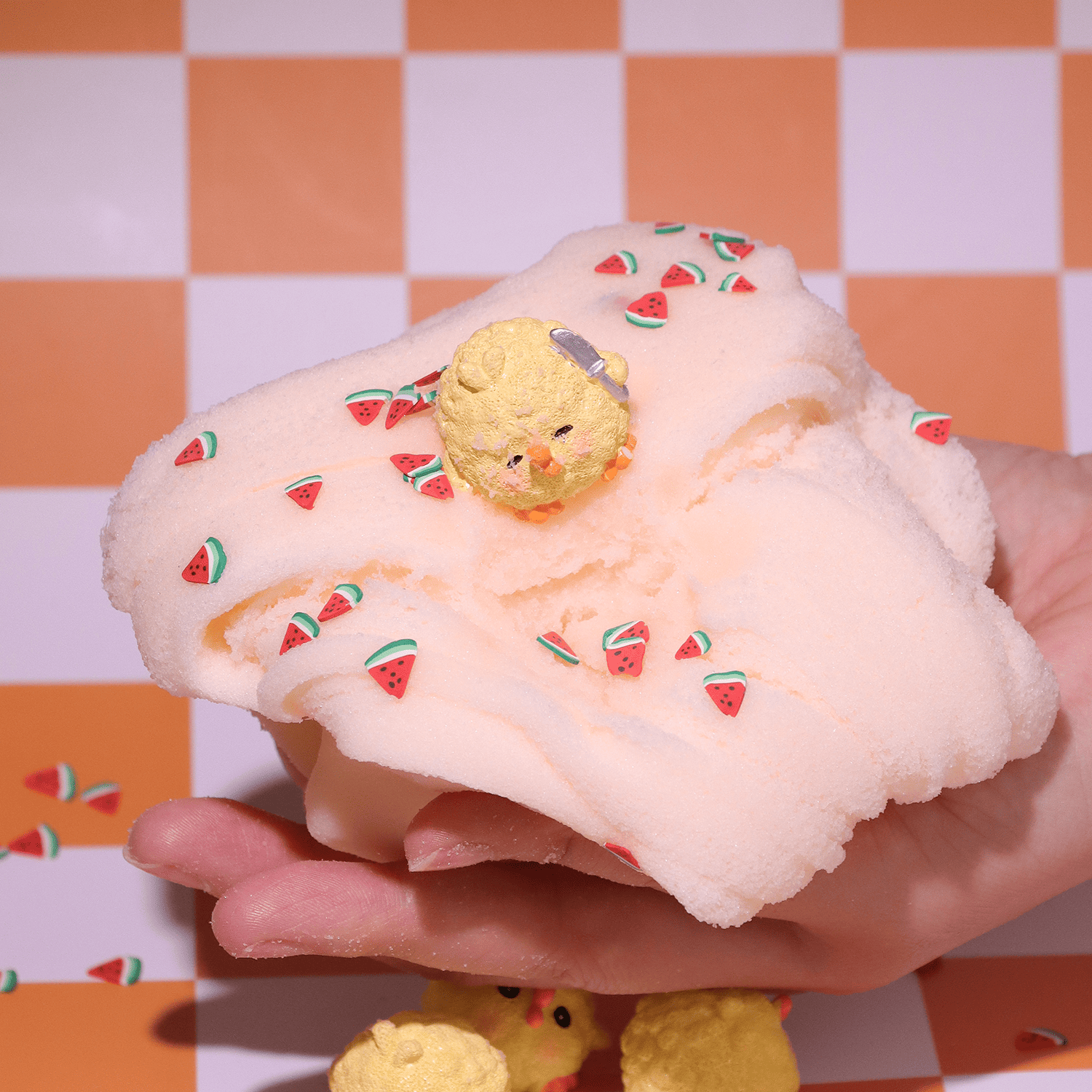 Add-ins: Features adorable chick decorations, along with mini watermelon slices or mushroom and candy pieces, adding playful charm to the slime.