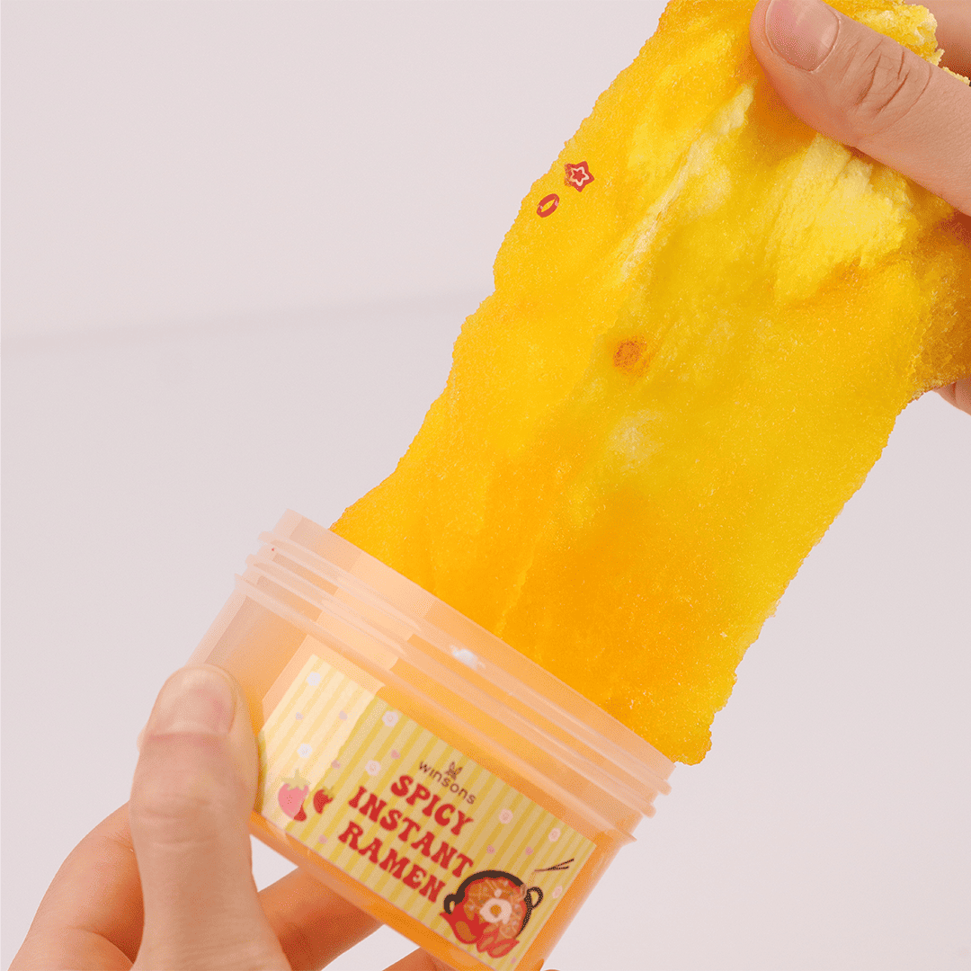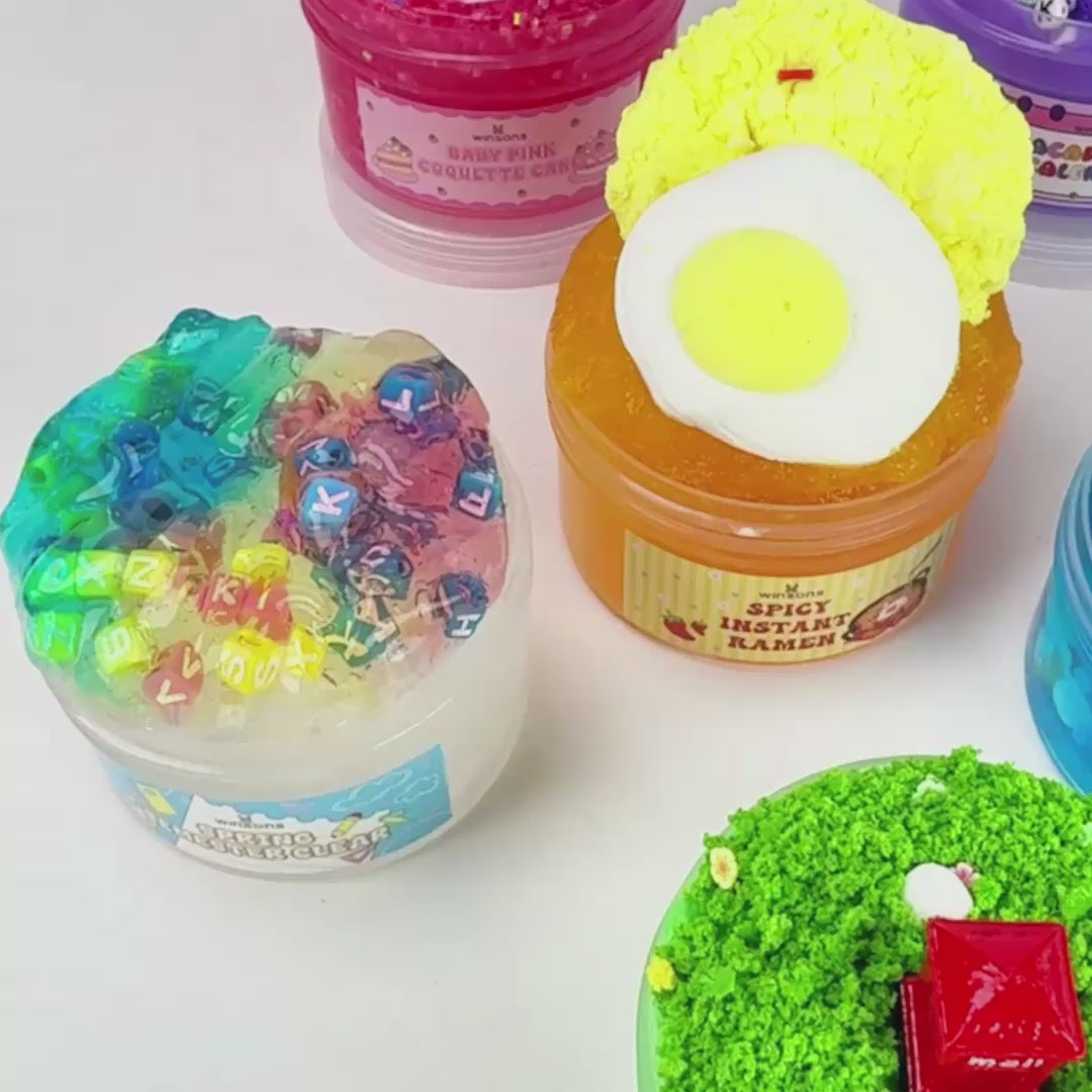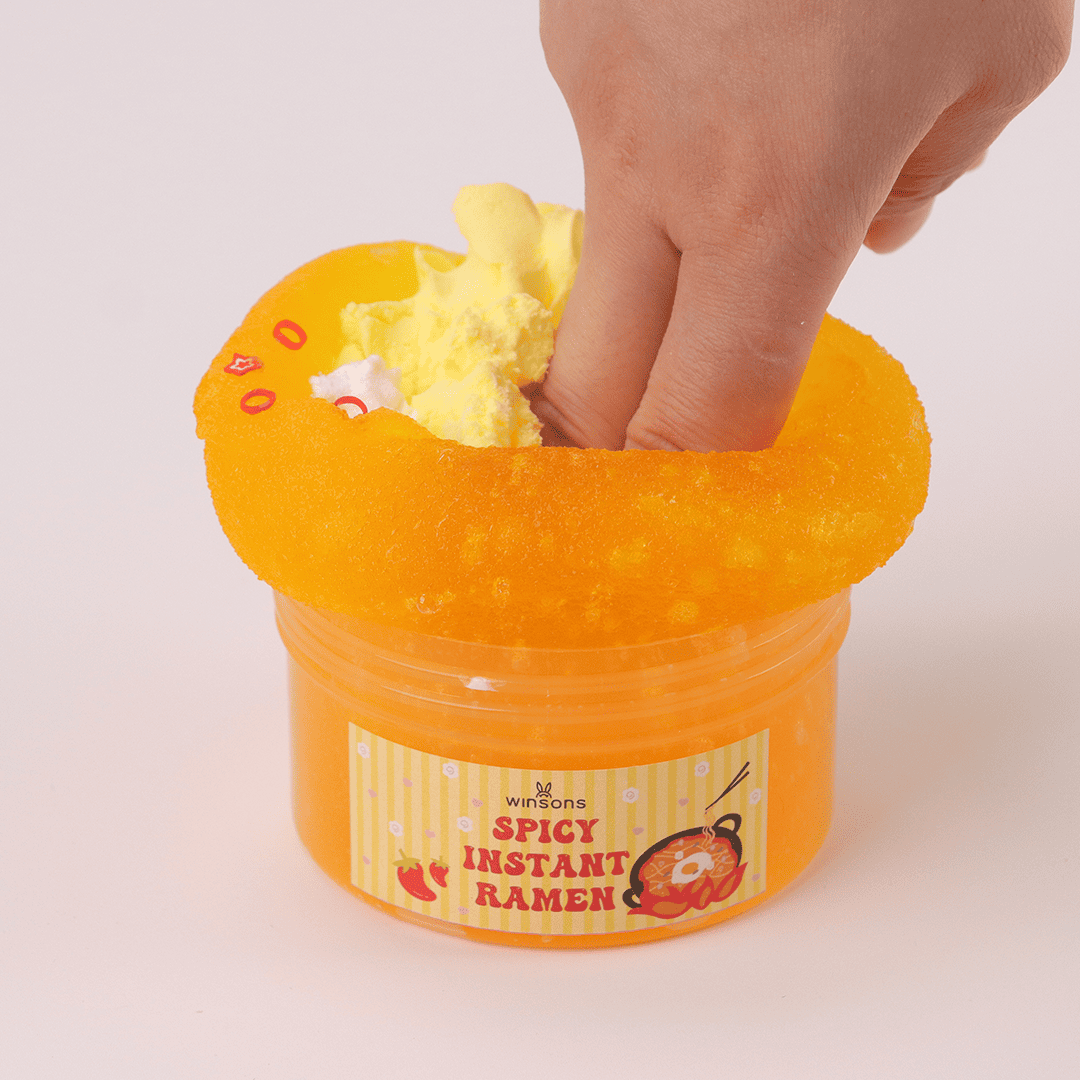 - Spicy Instant Ramen Slime: A thick, glossy, clear slime with realistic noodle-like textures, ramen toppings, and chili powder-inspired accents, creating an ultra-stretchy and fun-to-handle slime.