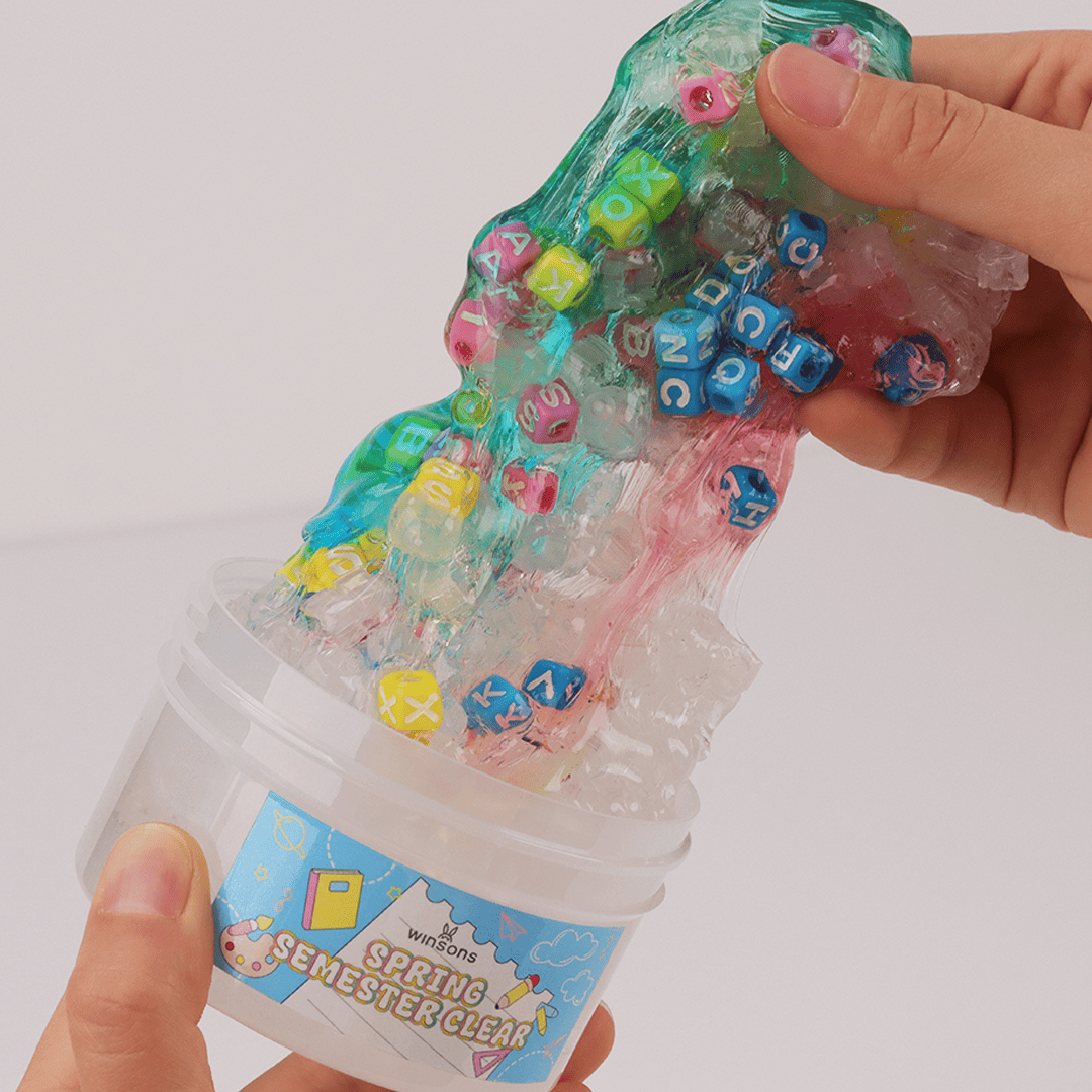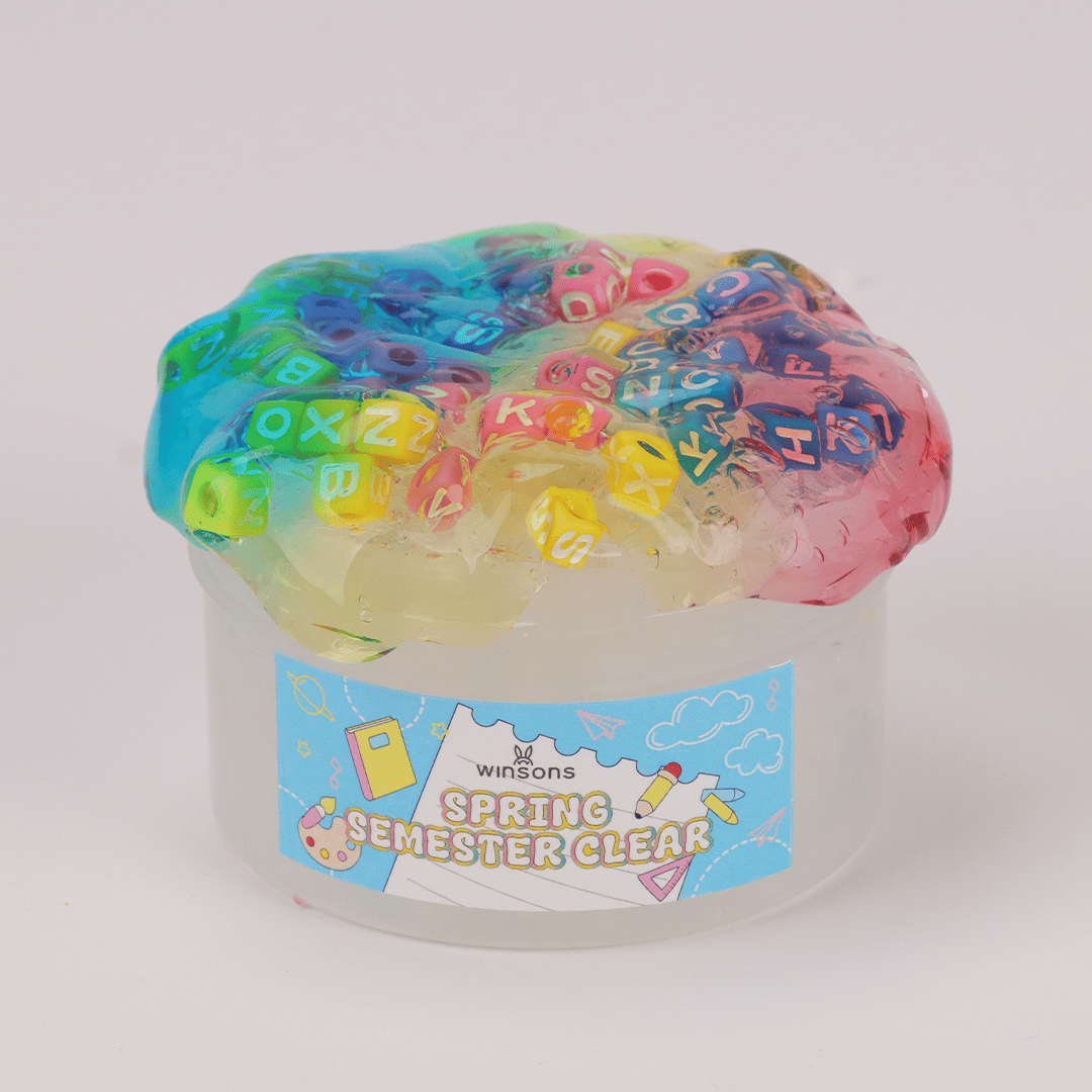 - Spring Semester Slime: A transparent, ultra-stretchy slime layered with red, blue, and yellow clear slime, featuring book and letter charms, offering a crisp, satisfying pull and a unique visual effect.